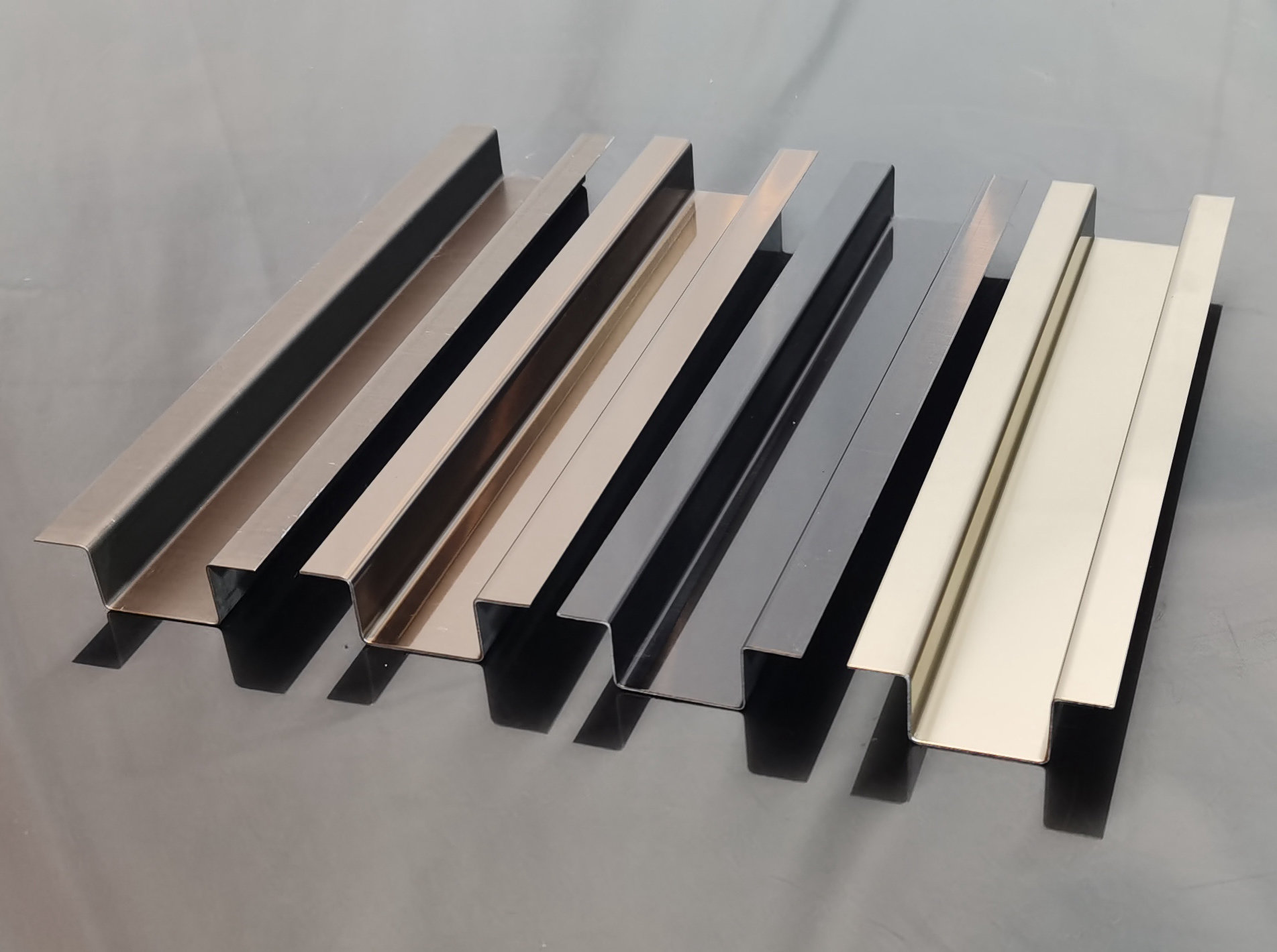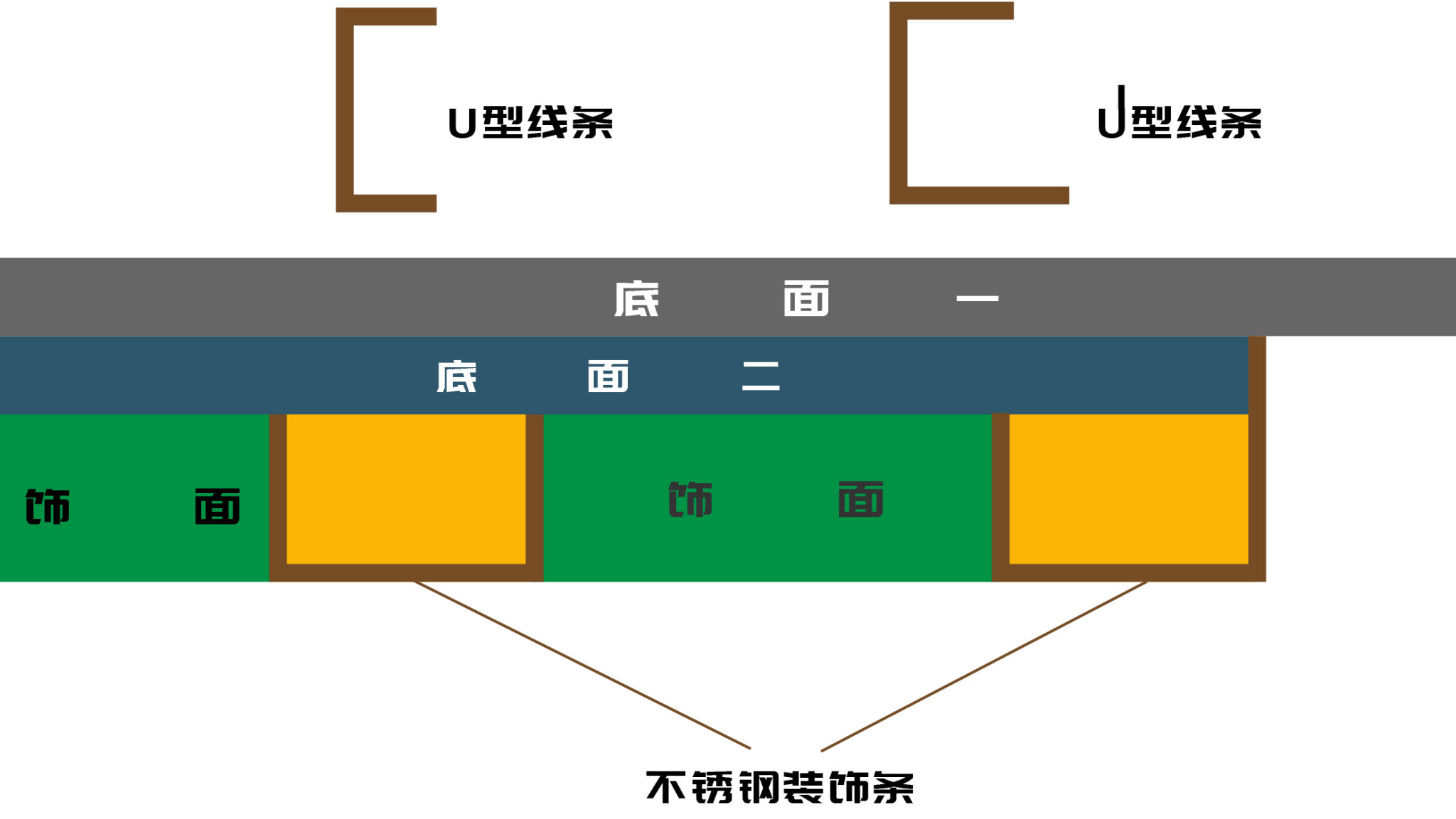 U型條常有2種:兩邊對(duì)等的U型和兩邊長(zhǎng)短不一的U型。平面采用兩側(cè)等效的U形金屬線,左右兩側(cè)無(wú)高差;而兩邊長(zhǎng)度不一致的U型金屬線條常用于左右兩邊有高低差的造型收口中,由于高差的不確定性,大部分需要現(xiàn)場(chǎng)定制。